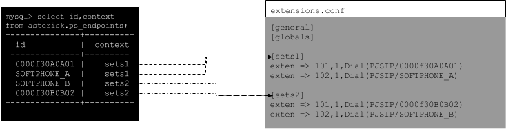 Рисунок. 6-2. Связь между конфигурацией канала (слева) и контекстами в диалплане (справа)