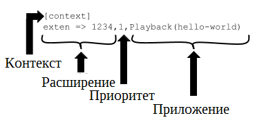 Структура диалплана состоит из четырех иерархических компонентов: контекстов (Context), расширений (Extension), приоритетов (Priority) и приложений (Application) (смотри Рисунок 6-1).