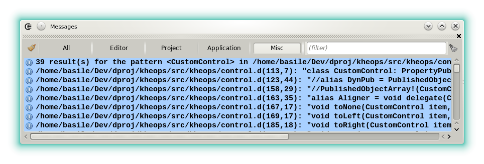 The _Find all_ results are displayed in the [messages widget](widgets_messages.html), with the context and they can be clicked.