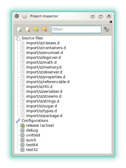 • : Adds a D source to the project from a dialog. The new source is not directly opened in the editor. To add a file that is already edited, rather use "Add file to project" from the File menu.
