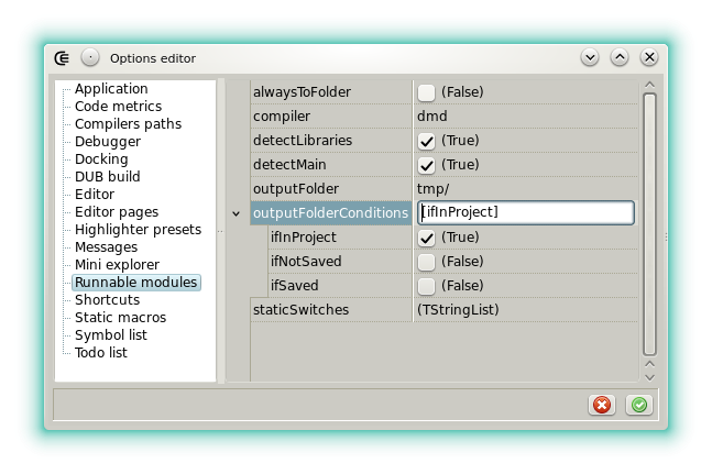 main()function is detected automatically and the-mainswitch is set accordingly. When not checked-mainis never passed. This options is useful with the Run file unittests action because it allows to test a module that's also a valid program. - outputFolder: Defines a folder where the runnable binary is output. If the value starts by a drive letter or a directory separator then the folder must exist, otherwise it's considered as a subfolder, relative to the runnable filename, which is created automatically.