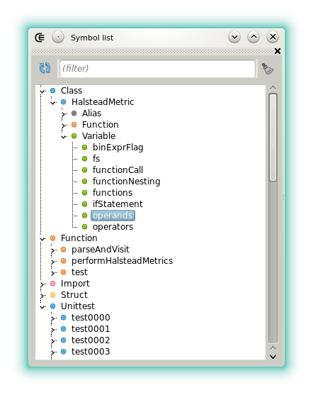 This list displays the symbols declared in the D module that has the focus (imports, classes, variables, etc). The widget is a GUI front-end for one the dastworx feature.
