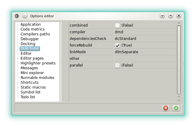 - verbosity: Allows to change the verbosity of DUB. This is interesting when you suspect a bug in the build tool and don't want to leave the IDE to verify.