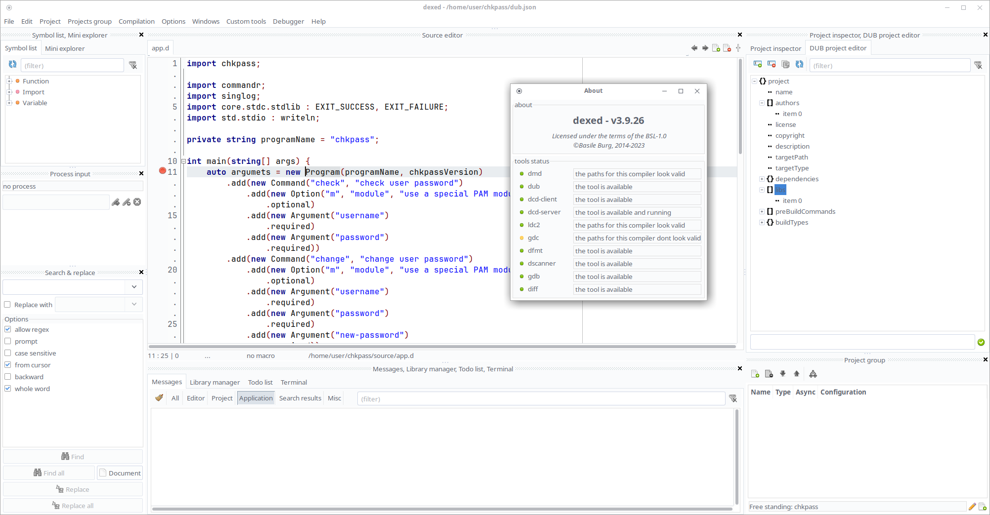 Dexed, расширенный редактор для D (D Extended EDitor), — это интегрированная среда разработки (IDE) для языка программирования D, его компиляторов, инструментов и библиотек.